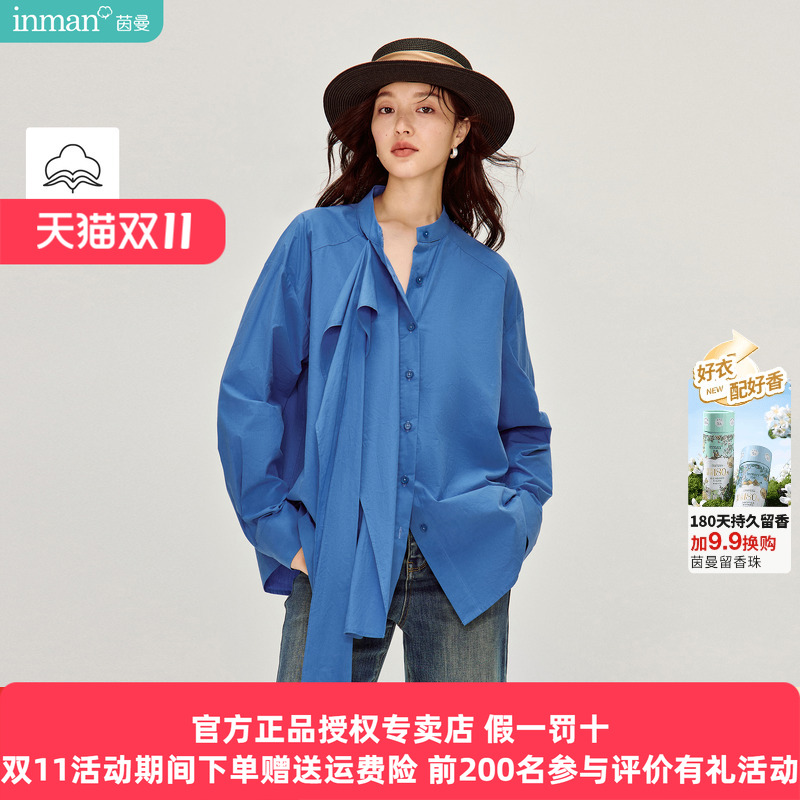 茵曼克莱因蓝系带纯棉衬衫2026春季女装新款设计感宽松长袖衬衣