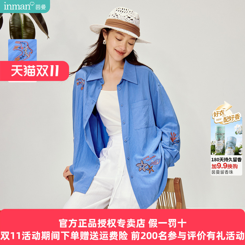 茵曼清新蓝色重工立体盘绳绣衬衫2026春季女装新款宽松长袖衬衣