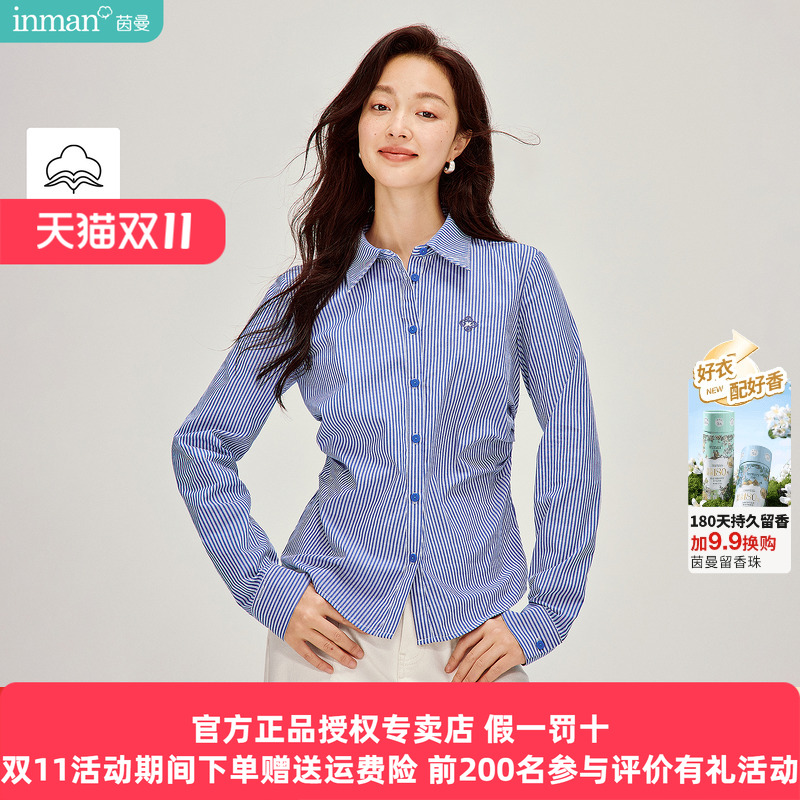茵曼条纹纯棉收腰修身衬衫2026春季女装新款设计感显瘦长袖衬衣