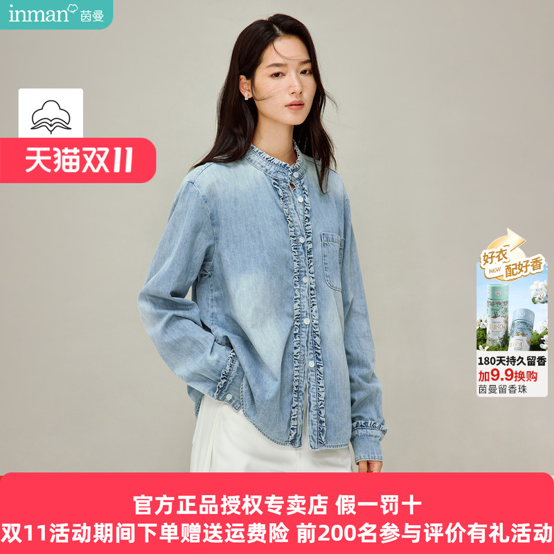 茵曼100棉做旧木耳边牛仔衬衫2026春季女装新款简约通勤长袖衬衣
