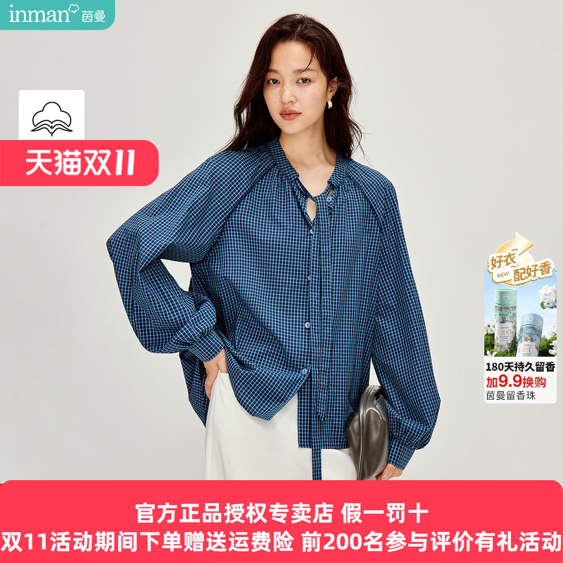 茵曼100棉宝蓝色格纹绑带衬衫2026春季女装新款宽松长袖气质衬衣
