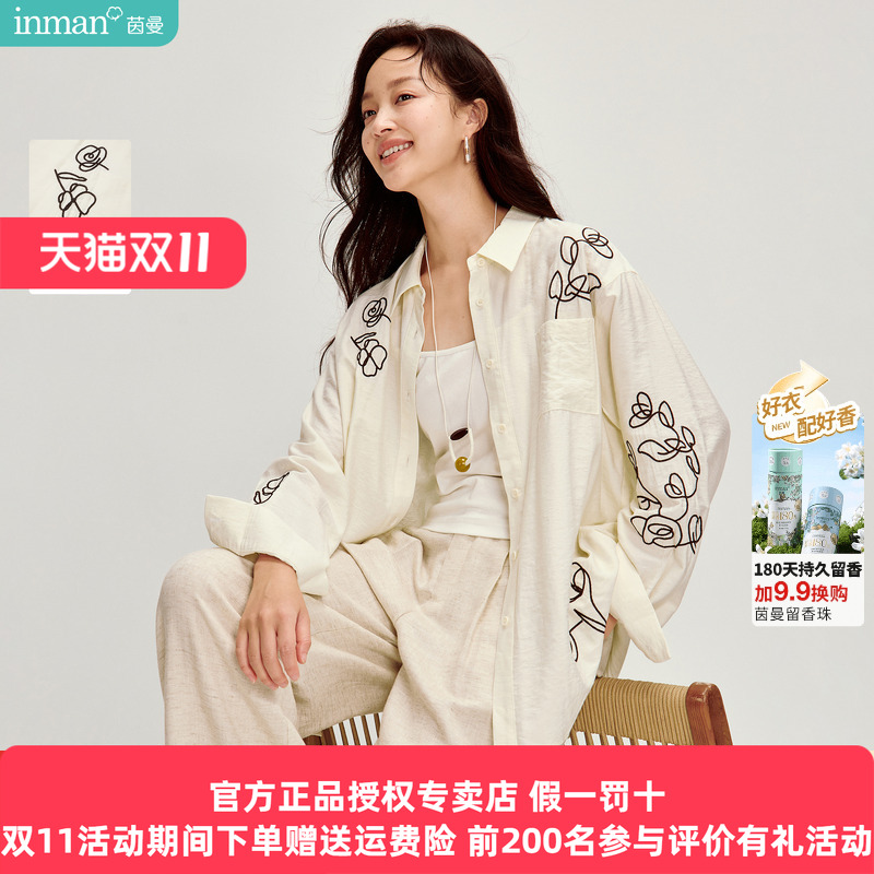 茵曼苎麻棉刺绣轻薄衬衫2026春季女装新款休闲百搭宽松长袖衬衣