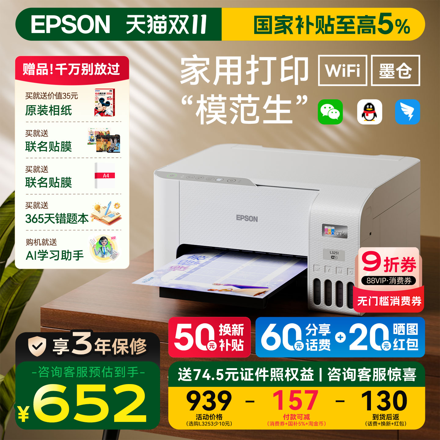 【政府补贴减20%】爱普生彩色打印机L3251/3256/3556/1259家用小型epson无线墨仓复印扫描学生照片办公一体机
