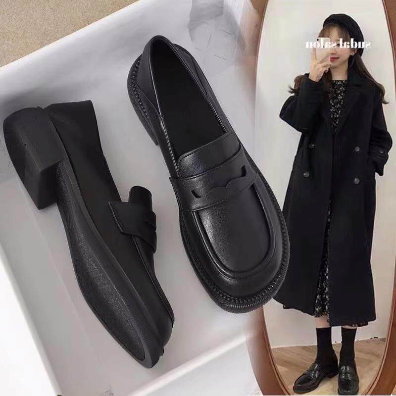 韩版乐福鞋一脚蹬软底小皮鞋JK鞋粗跟百搭英伦风黑色单鞋猪皮鞋垫