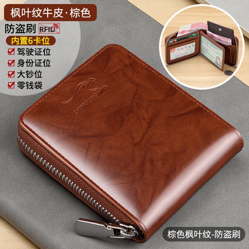 真皮钱包牛皮钱包男士短款袋鼠域牛皮钱夹有拉链可装驾驶证卡包新
