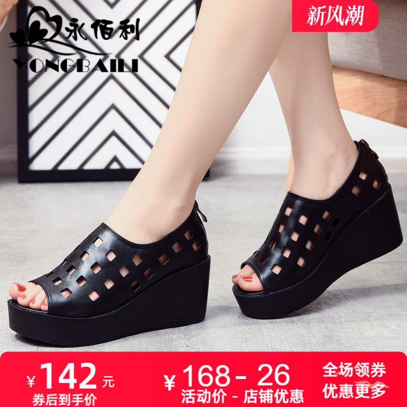 真皮罗马凉鞋2025夏新款高跟松糕鞋女厚底镂空鱼嘴休闲女鞋皮鞋