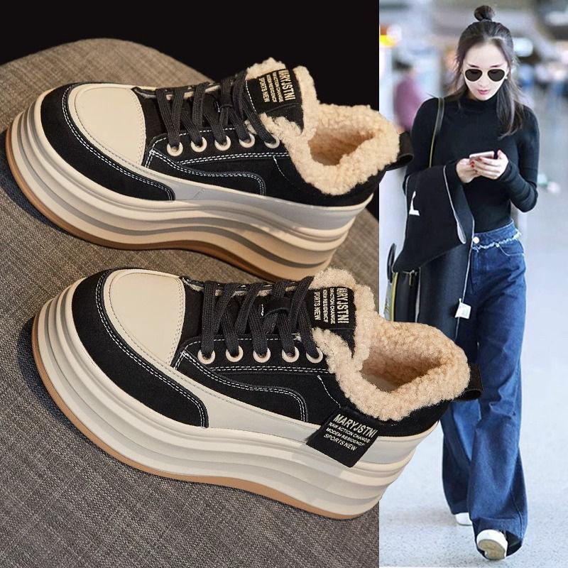 2025新款冬季加绒真皮女鞋内增高松糕鞋女厚底休闲黑色系带单鞋女