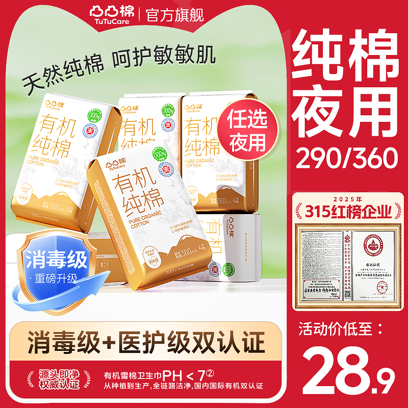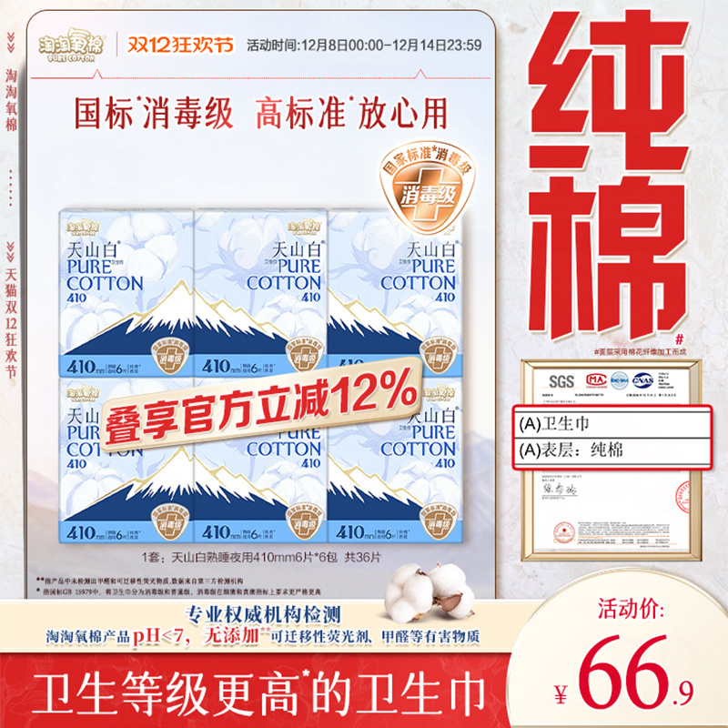 【国标消毒级】淘淘氧棉天山白消毒级纯棉卫生巾夜用410mm姨妈巾