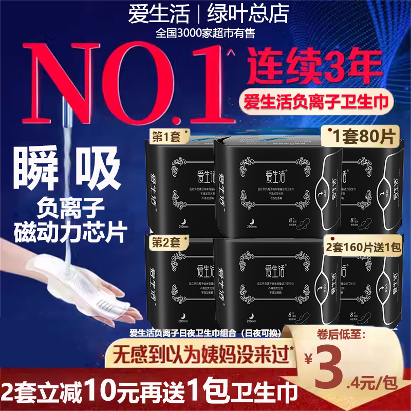 绿叶爱生活卫生巾夜用超薄透气负离子芯片棉柔姨妈巾整箱10包正品