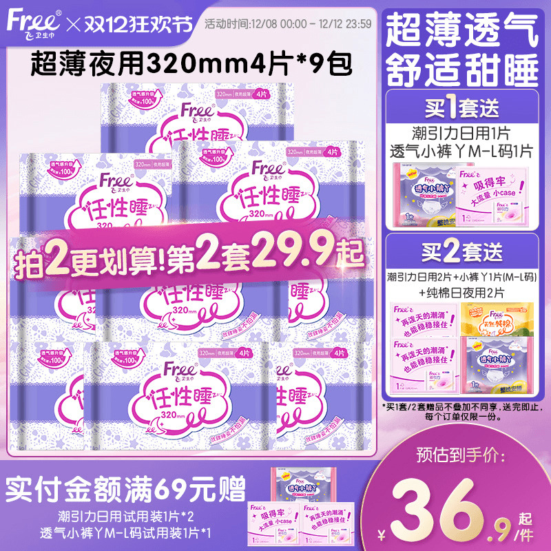 自由点卫生巾夜用430mm超长组合装官方旗舰姨妈巾店正品整箱批发