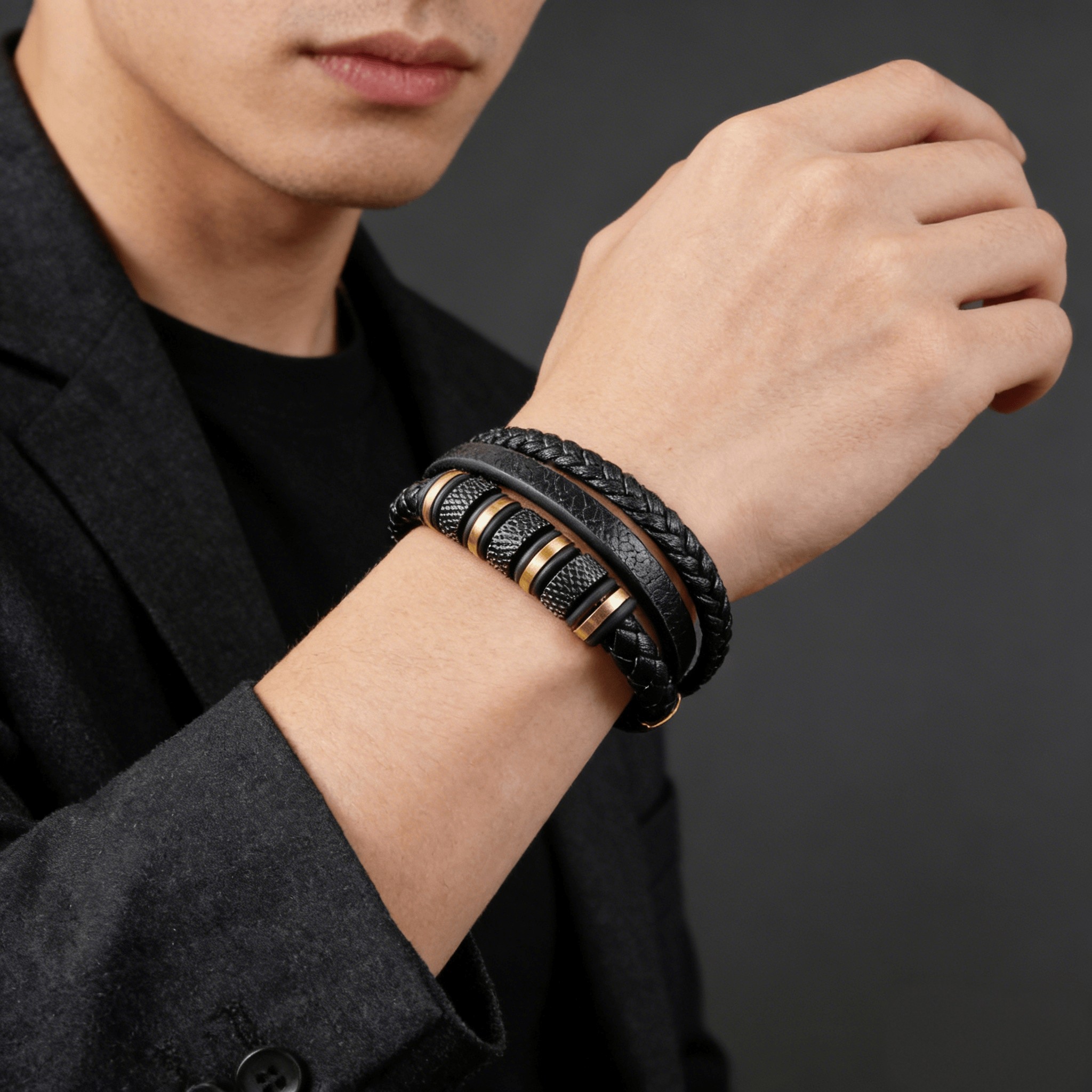 皮绳手链不锈钢皮革编织手镯真皮多层首饰男士潮流小众个性高级感