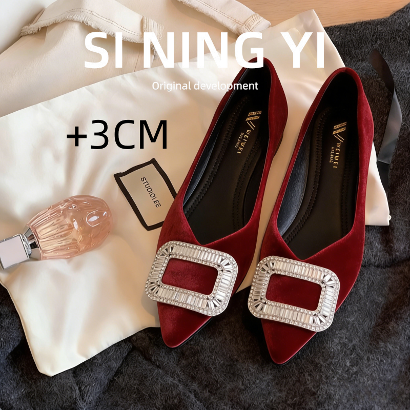 羊皮版~尖头V扣内增高单鞋女秋冬浅口裸色平底瓢鞋大码女鞋41到43