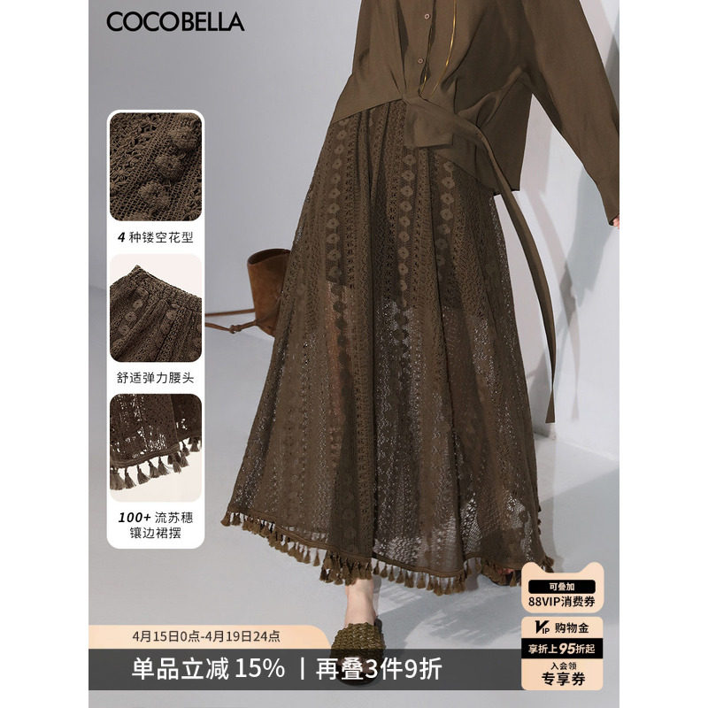 【3件5折】COCOBELLA镂空刺绣蕾丝半身裙女流苏大摆长裙HS3063-3