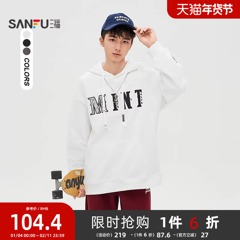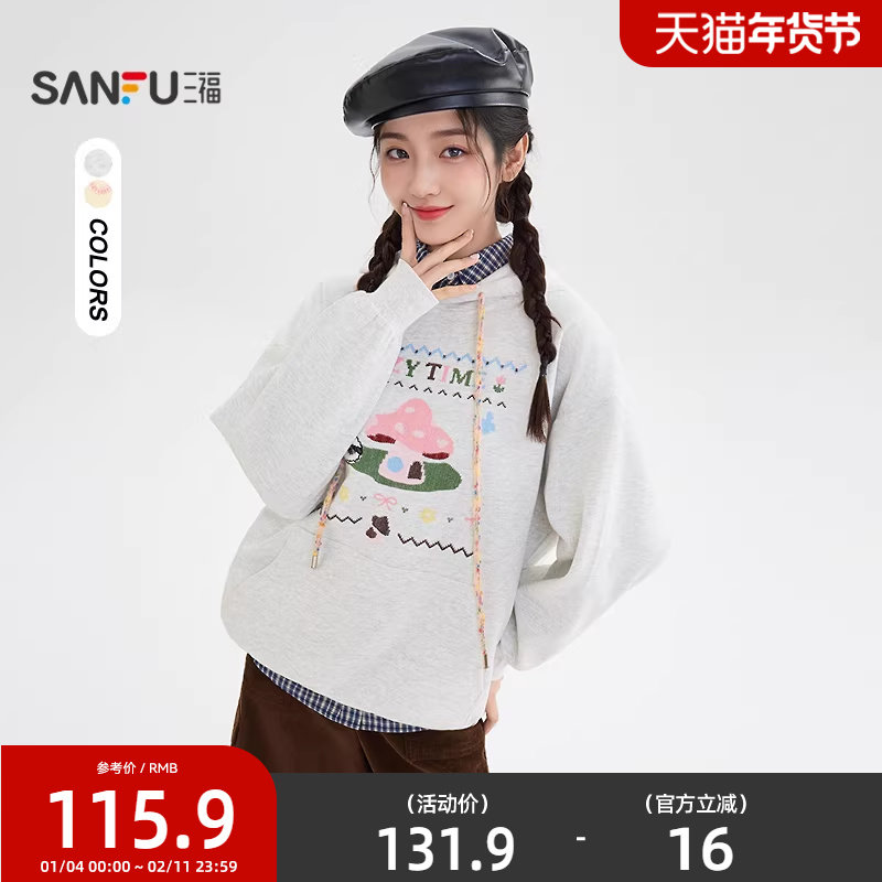 三福卫衣女2025新款冬季时尚洋气个性图案连帽宽松上衣女装510481