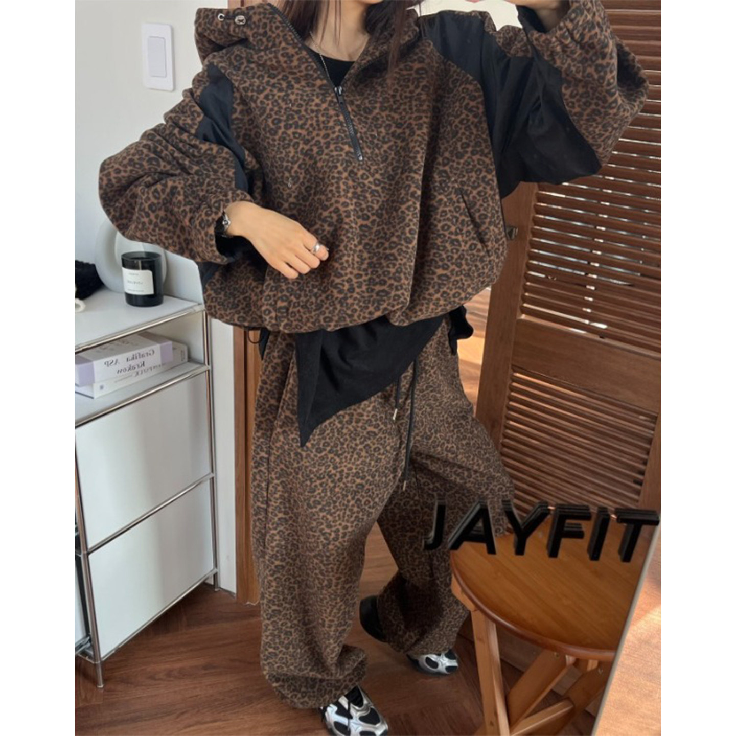 复古个性拼接豹纹连帽卫衣外套女2025冬季新款高腰休闲长裤两件套