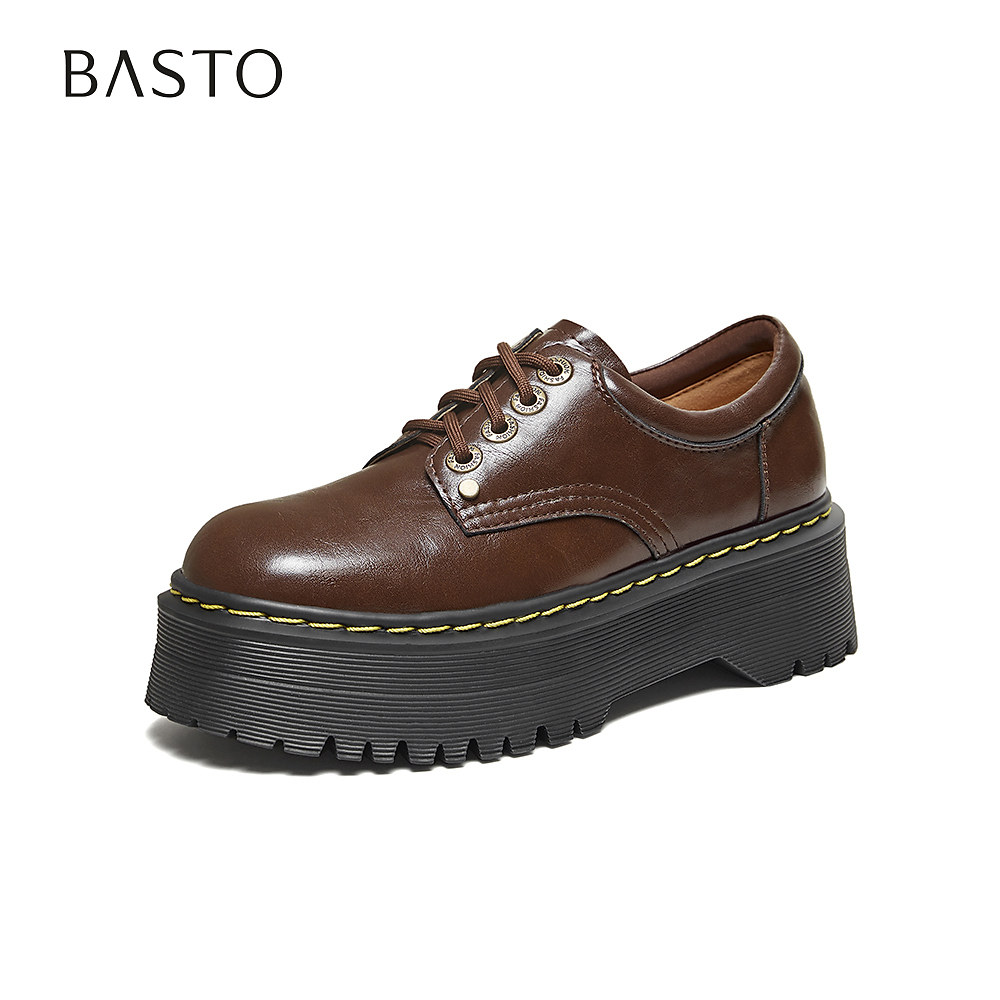吉步厚底小皮鞋2025新款英伦风粗跟真皮单鞋圆头系带学院风女鞋子