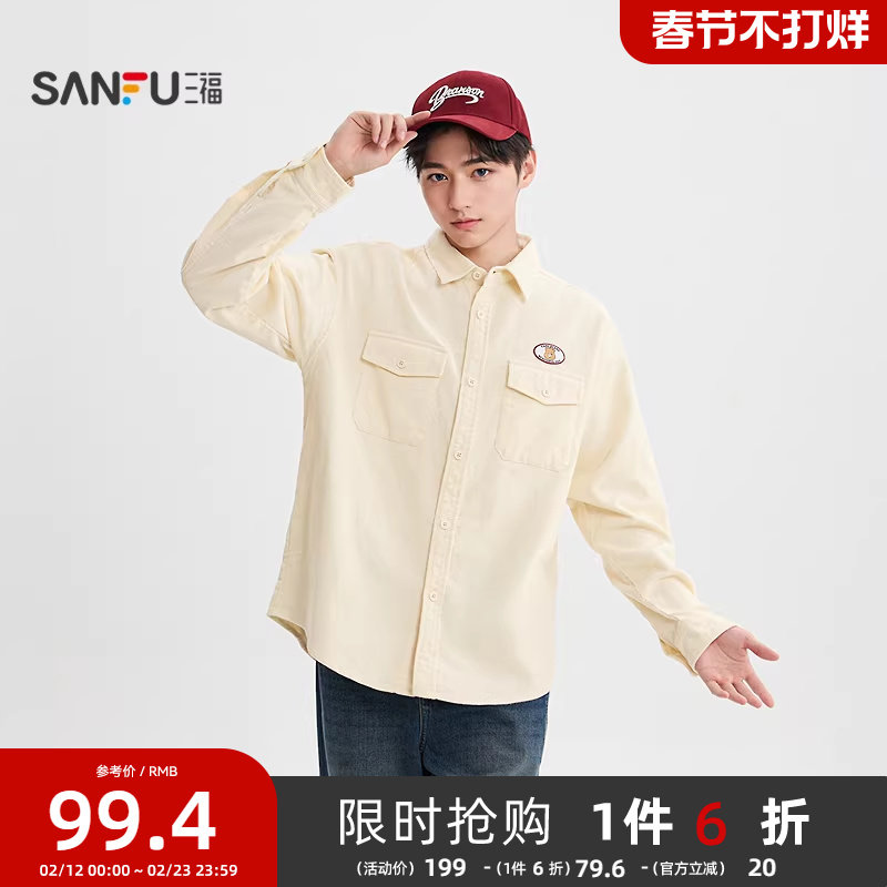 三福2025冬季男士灯芯绒工装长衬衫 小熊徽章宽松上衣511782
