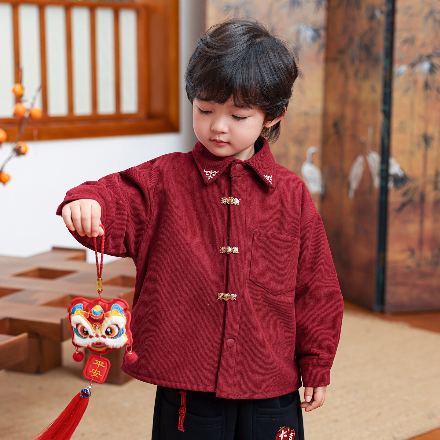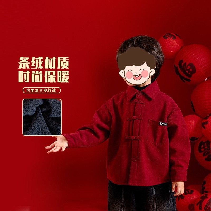 男童加绒灯芯绒衬衫儿童装新中式拜年服男童冬季宝宝过年红色衣服