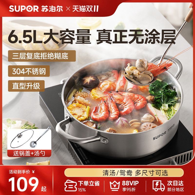 苏泊尔鸳鸯锅火锅锅具家用电磁炉专用加厚304不锈钢火锅盆大容量
