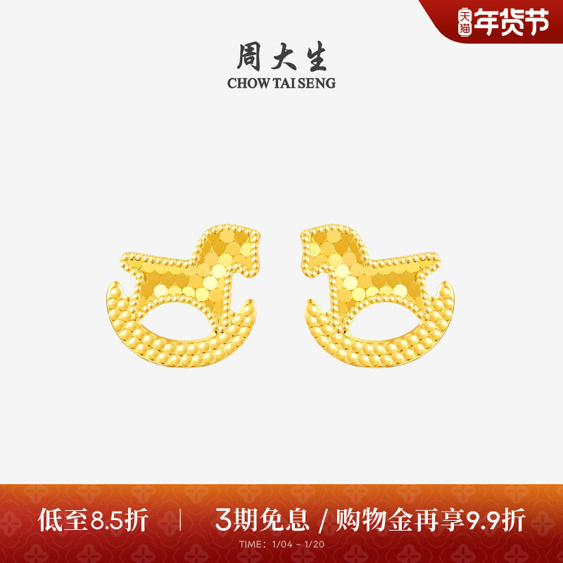 周大生黄金耳钉女5G足金耳饰爆闪碎碎冰小木马耳环送女友生日礼物