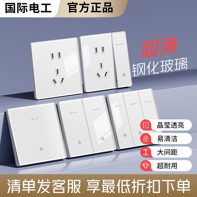 国际电工超薄钢化玻璃开关面板86型单开五孔插座正品套装全屋定制