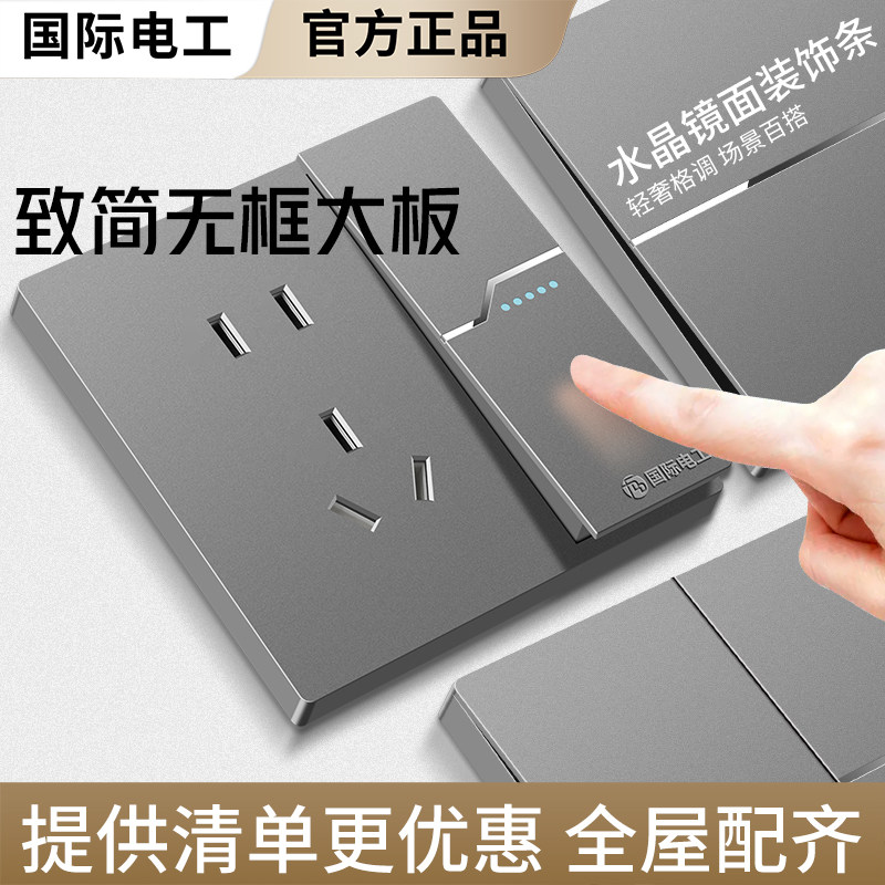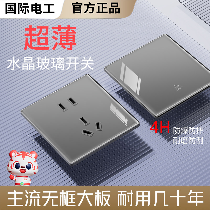 国际电工灰色超薄水晶玻璃86型开关插座套装面板家用墙壁一开五孔
