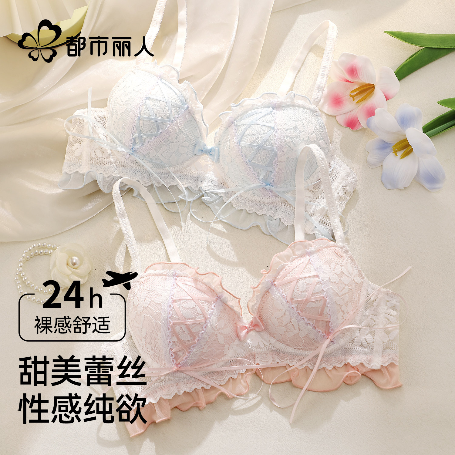 都市丽人蕾丝内衣女聚拢小胸纯欲风显大防下垂甜美洛丽塔绑带文胸