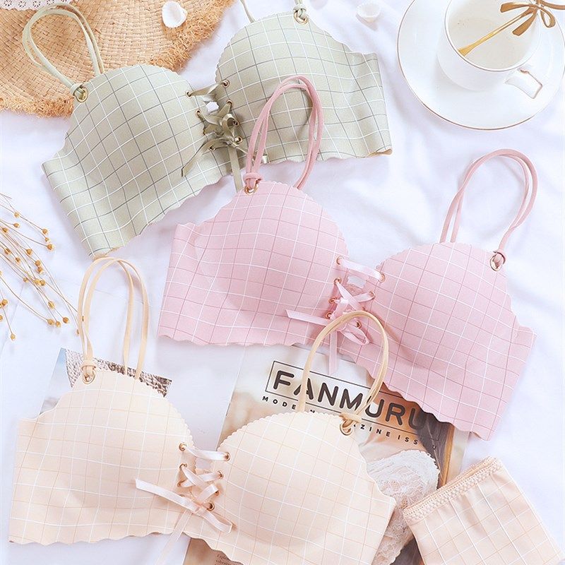 一片式无痕内衣女无钢圈学生薄款少女小清新可爱拉绳聚拢绑带文胸