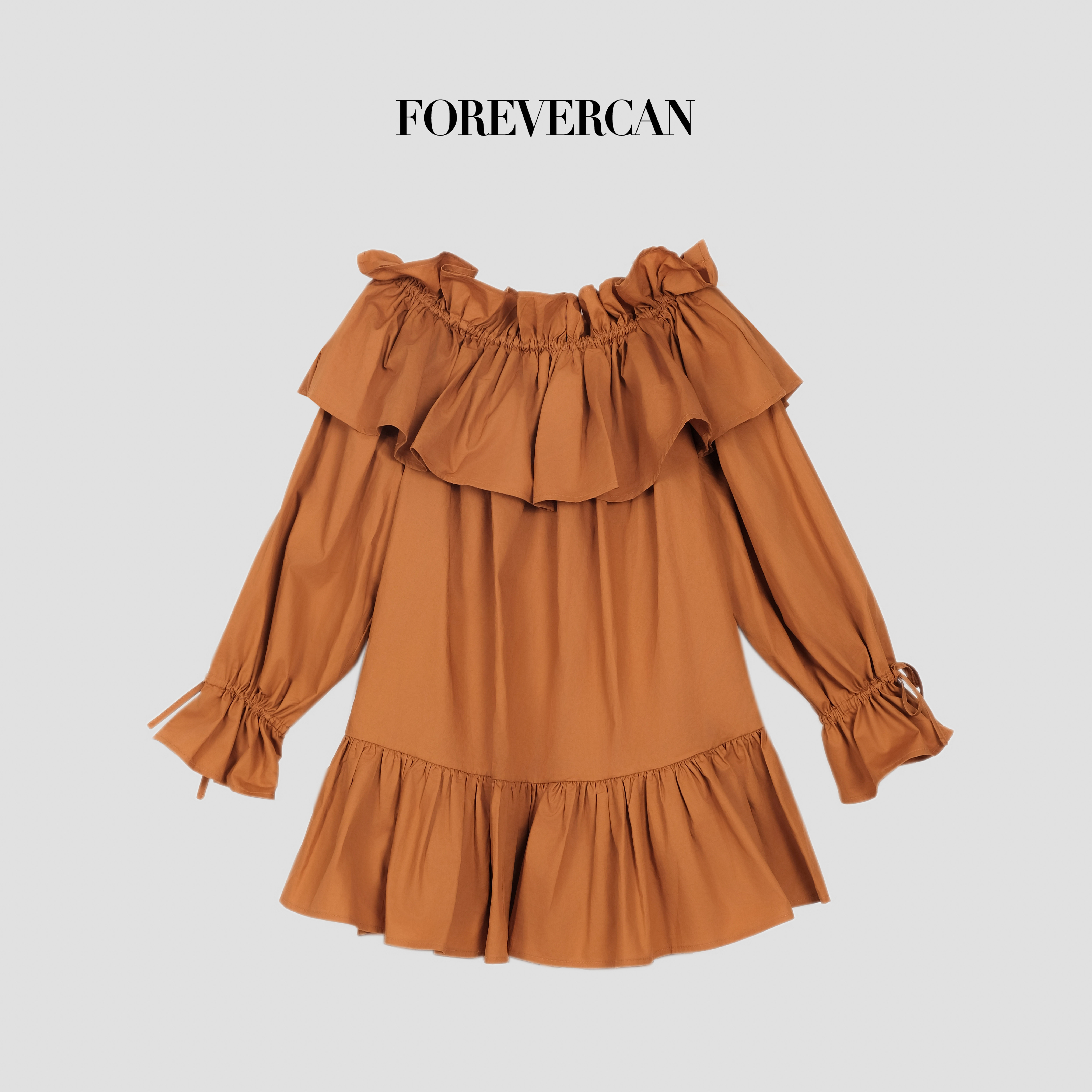Forevercan女装新款“博洛尼亚”古力娜扎同款荷叶边一字肩连衣裙