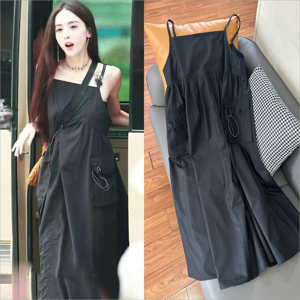 欧购花儿与少年古力娜扎同款黑色吊带连衣裙女夏新款长款工装裙子