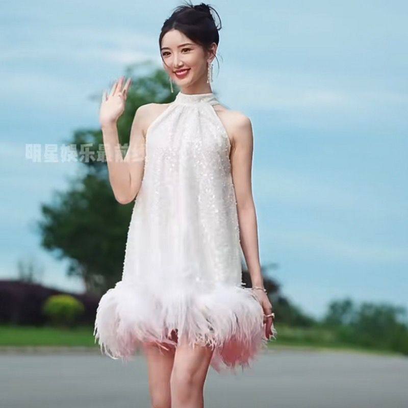 怦然心动古力娜扎毛晓彤同款白色亮片钉珠挂脖连衣裙露背A字裙女
