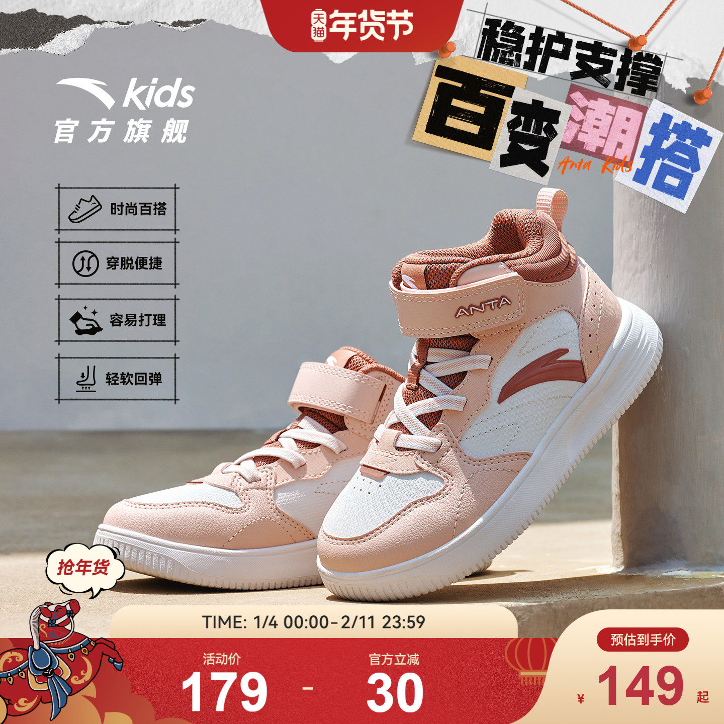 安踏儿童板鞋女童鞋子2025冬季新款户外防风高帮板鞋校园滑板鞋