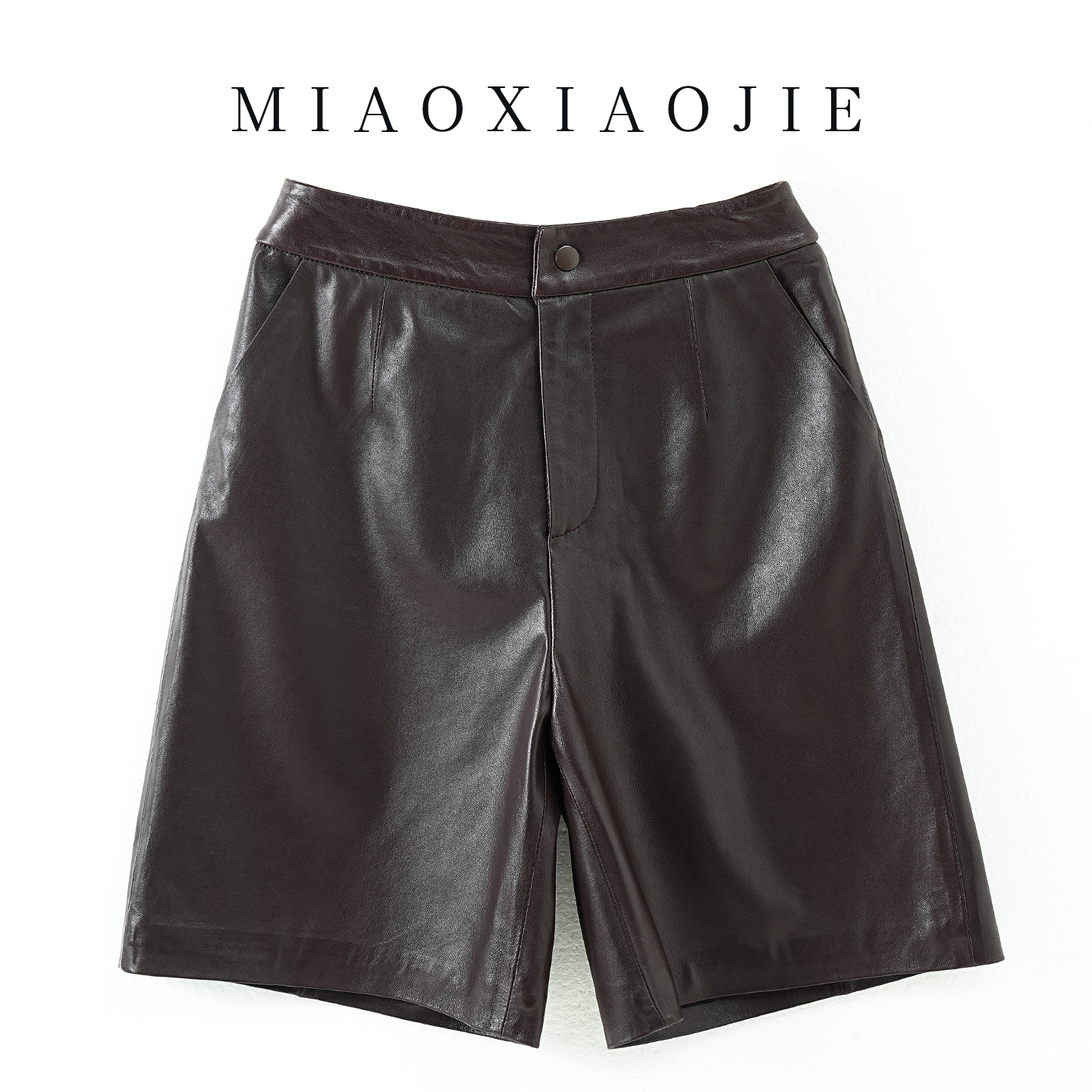 高级感 欧洲站小羊皮2025秋新款真皮五分皮裤女高腰皮中裤阔腿裤