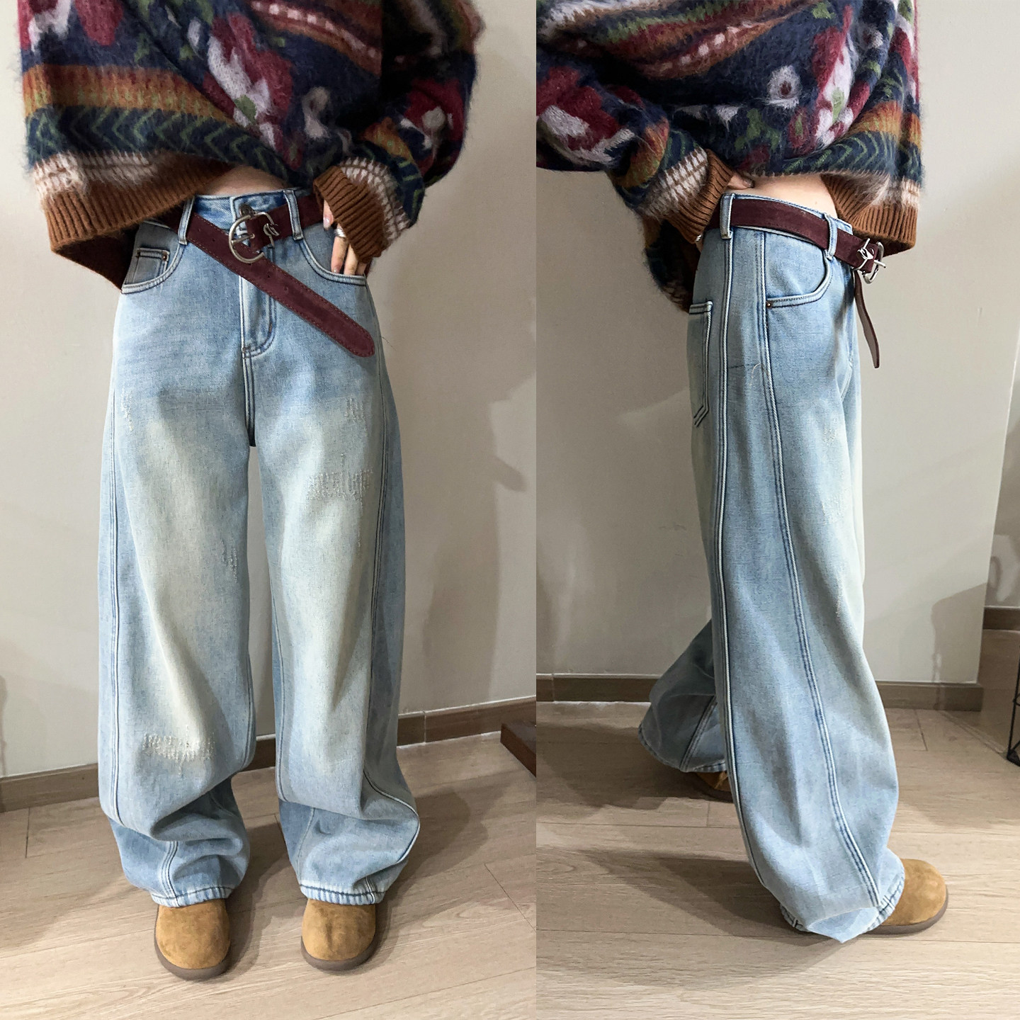 浅蓝色拖地加绒牛仔裤女欧洲站2025冬装新款欧货女装窄版阔腿裤潮