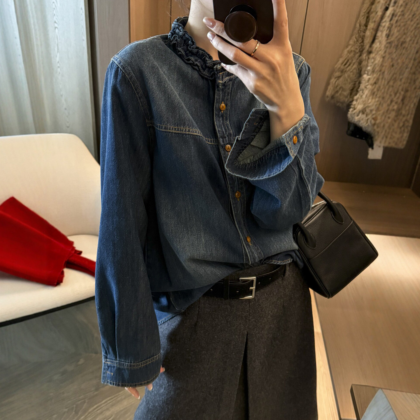 木耳花边领牛仔衬衫女欧洲站2025冬装新款欧货女装时尚洋气上衣潮