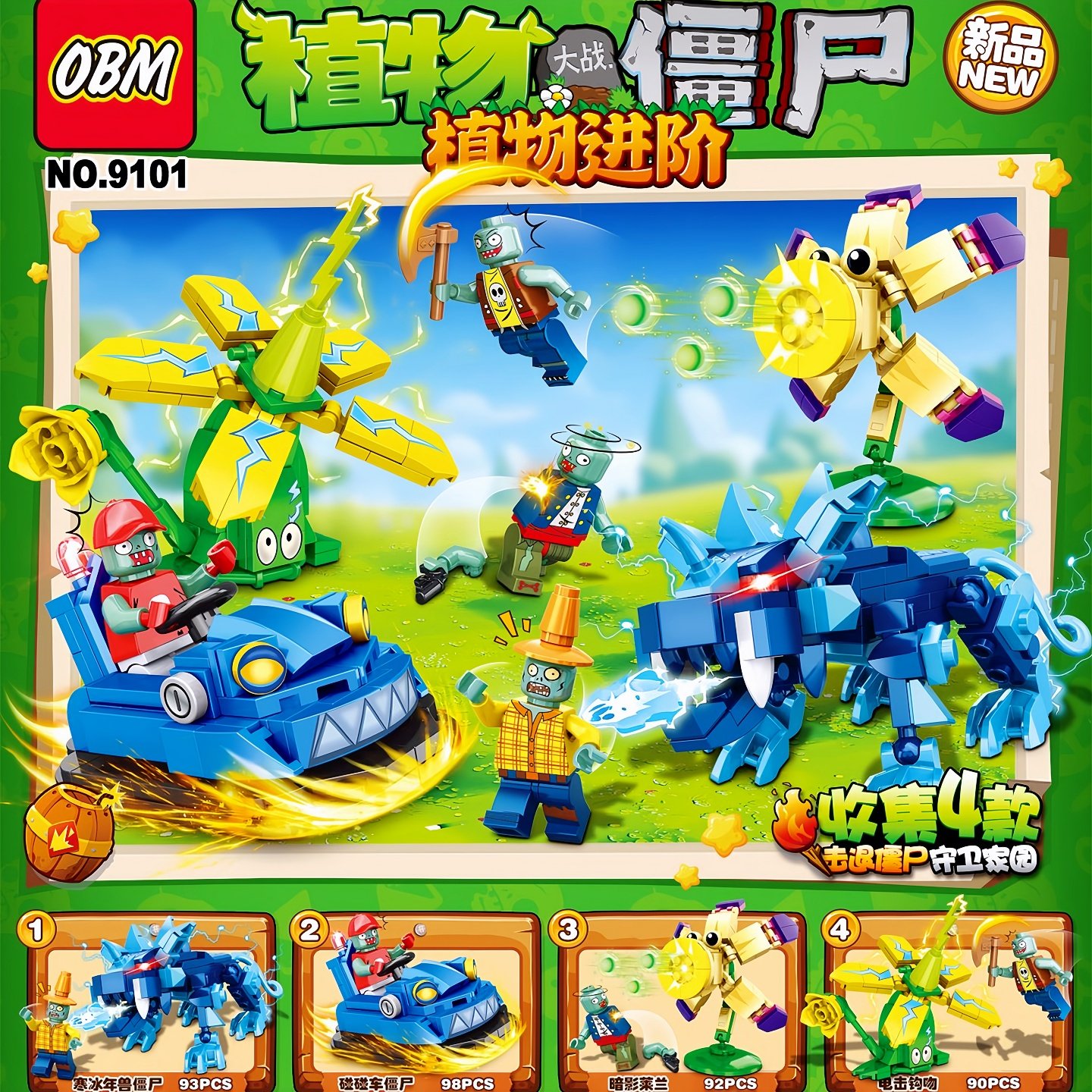 植物大作战8合1寒冰年兽巨炮僵尸王机械虫恶龙小鬼组装积木玩6+