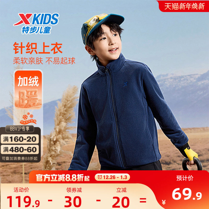 特步童装秋冬新款男大童摇粒绒卫衣外套儿童运动保暖女童柔软外套
