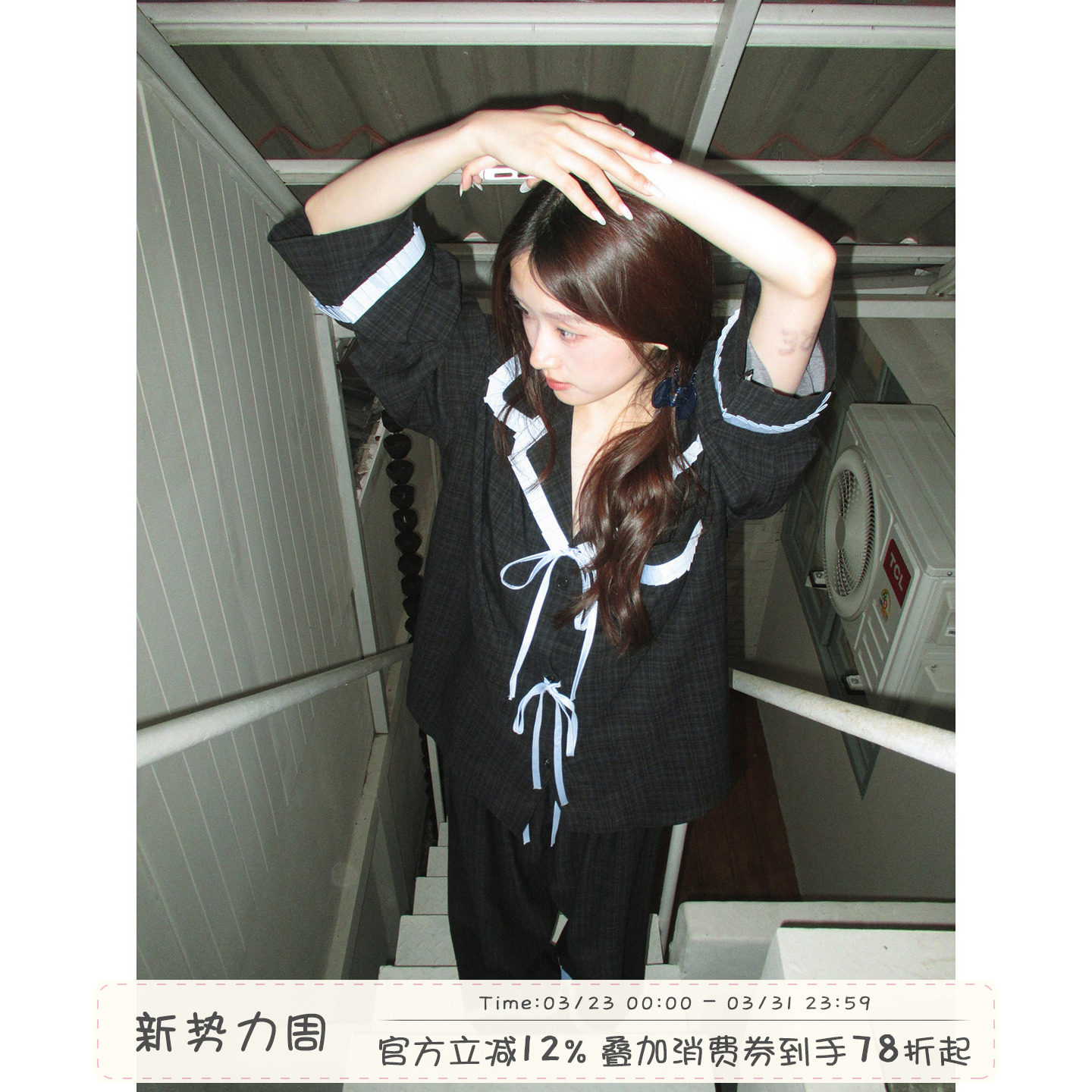 馨帮帮Homedress 撞色拼接格纹睡衣套装女款春季蝴蝶结宽松家居服