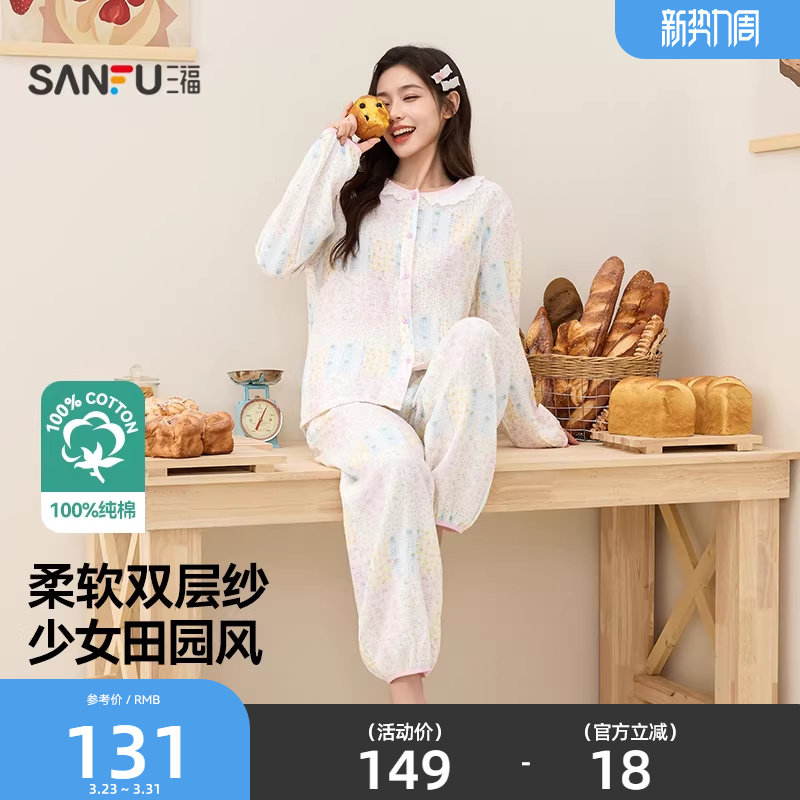 三福女春季拼布碎花套装 甜系多巴胺甜妹风宽松家居服515074