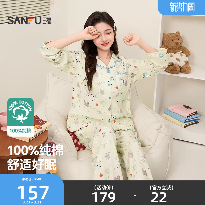 三福女春季翻领排扣睡衣套装 趣味动物宽松长袖家居服514833