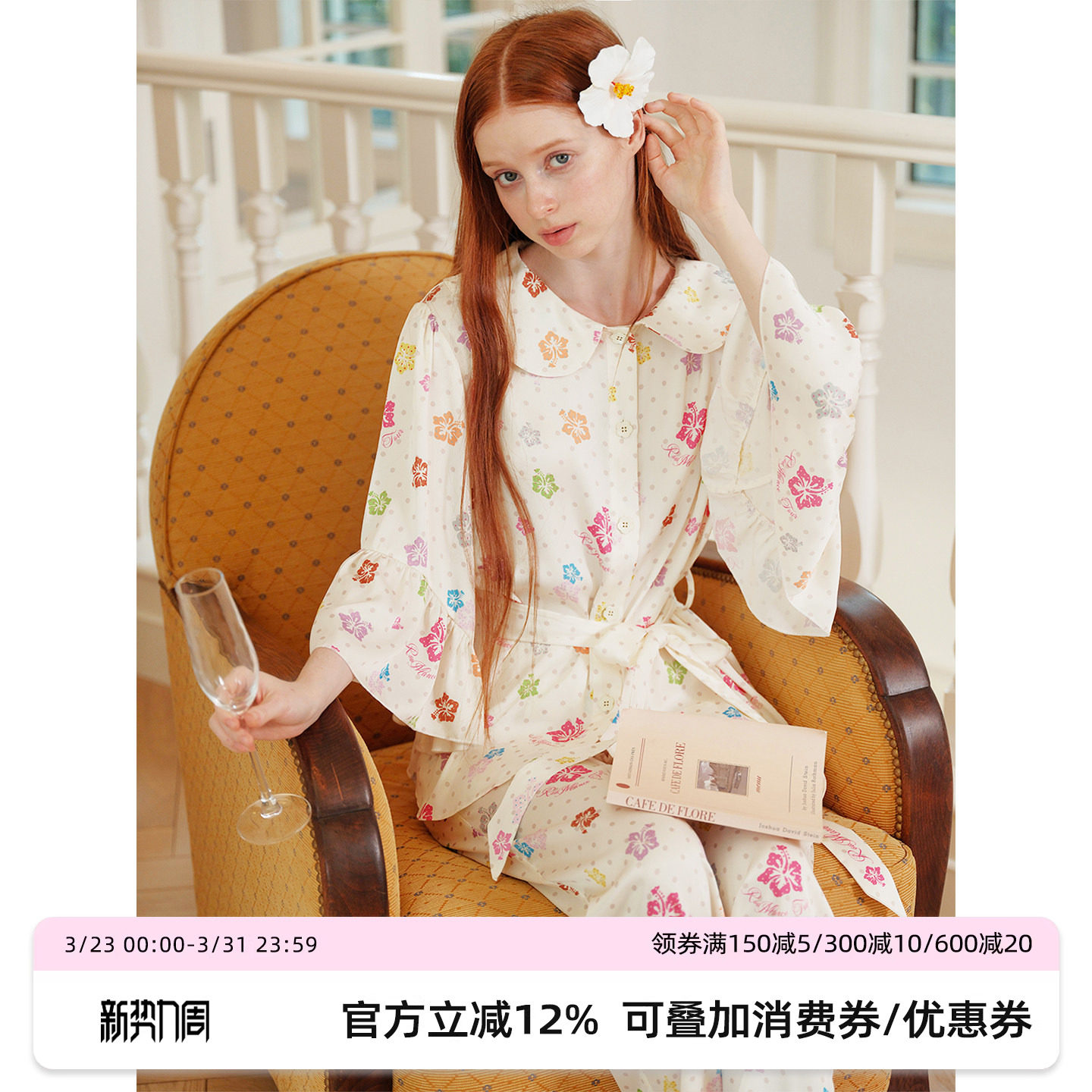 妮狄娅睡衣女春季纯棉纱布长袖开衫花卉法式田园风春秋家居服套装