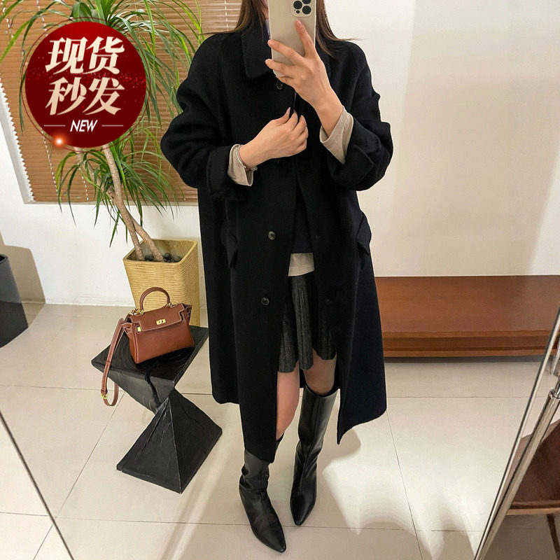 - 韩版黑色大衣女中长款