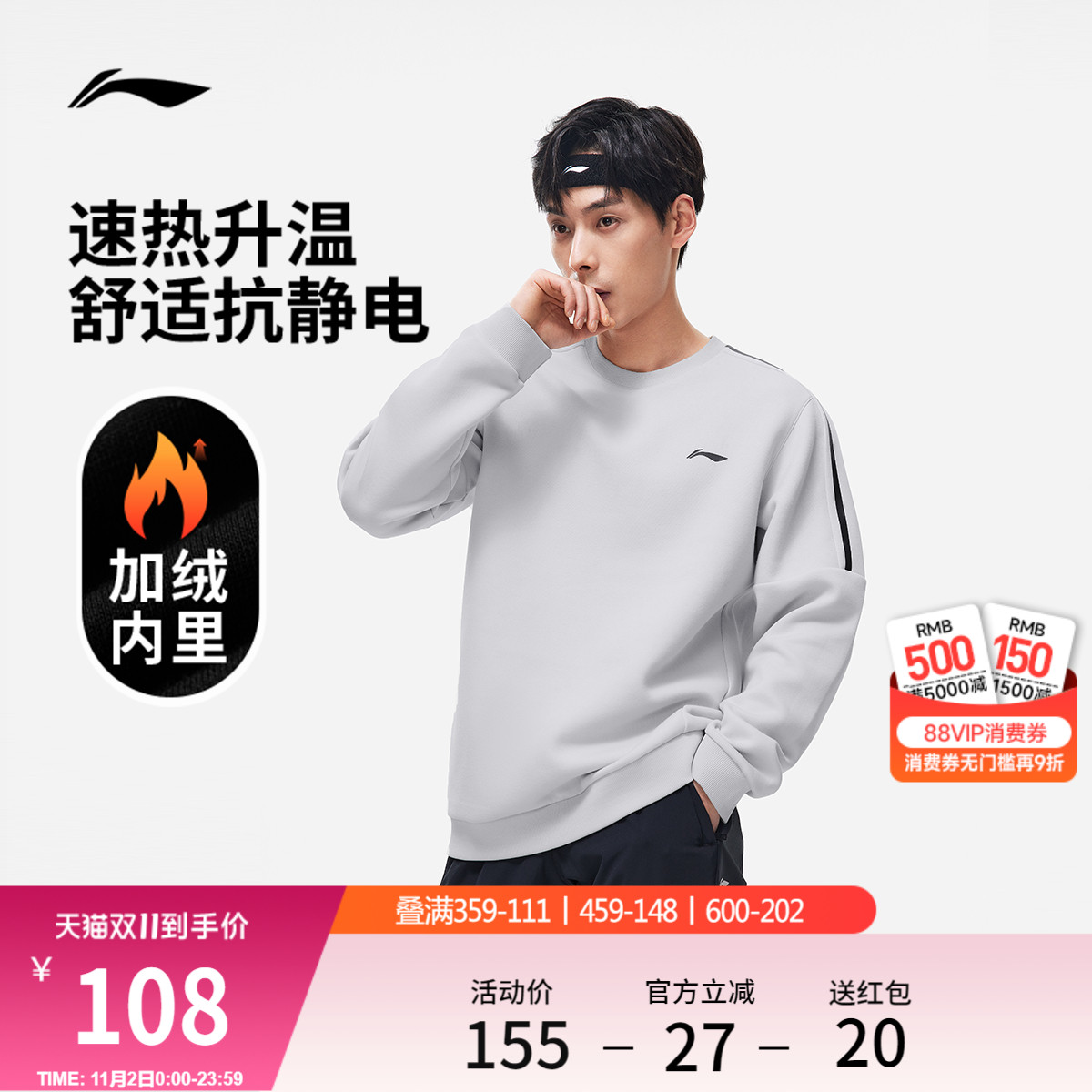 李宁卫衣男士秋冬健身跑步男装圆领商务爸爸上衣加绒针织运动长袖