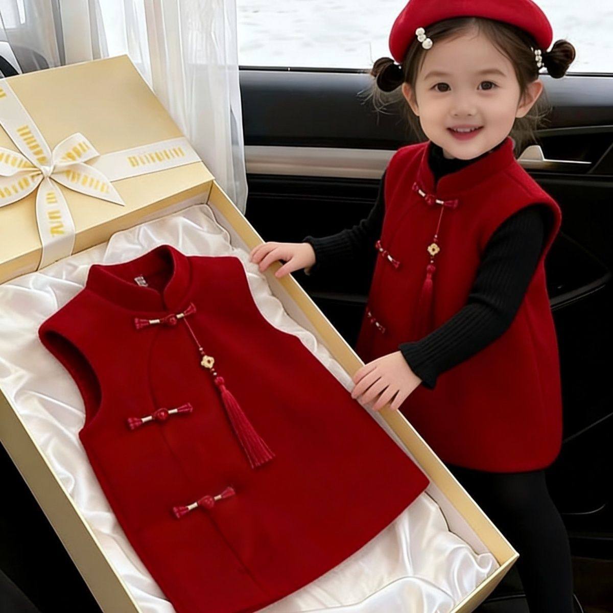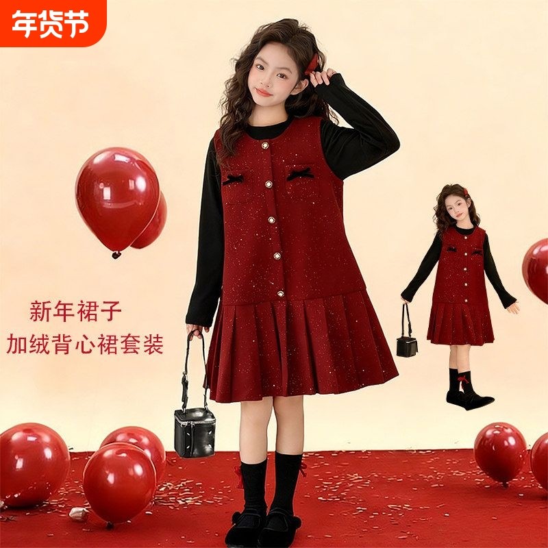 女童拜年服2025秋冬季新款洋气毛呢背心连衣裙儿童新年装公主裙子