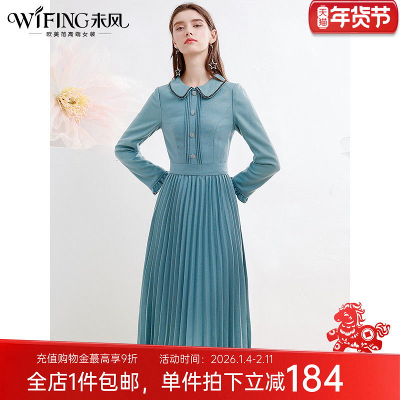 未风羊毛娃娃领连衣裙女秋冬2025年冬季新款百褶气质毛呢加厚裙子