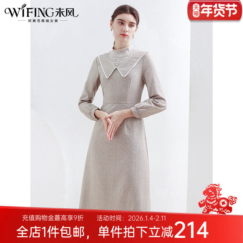 未风羊毛驼色毛呢连衣裙女秋冬2025年冬季新款娃娃领修身显瘦裙子