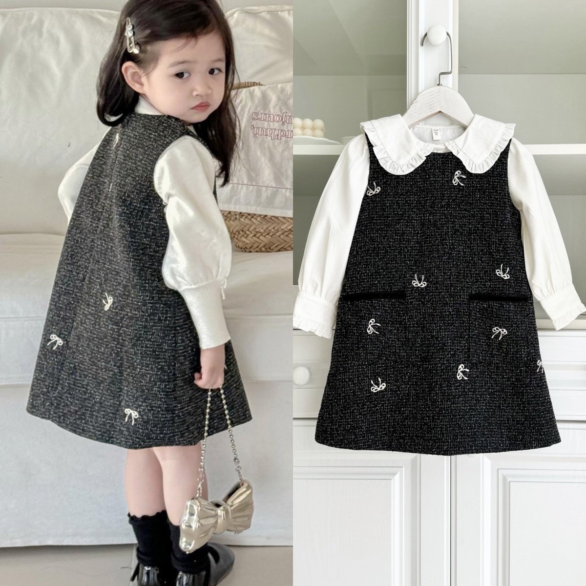 女童洋气韩版秋冬季小香风加厚仿毛呢背心裙儿童蝴蝶结气质连衣裙