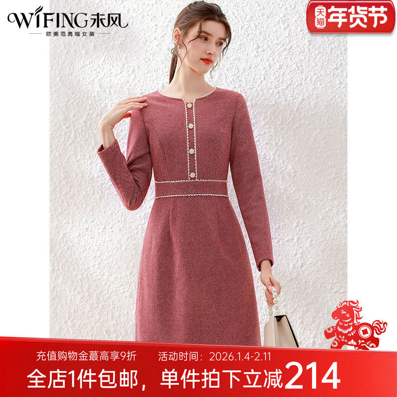未风红色毛呢连衣裙女秋冬2025冬季新款女装过年战袍气质加厚裙子