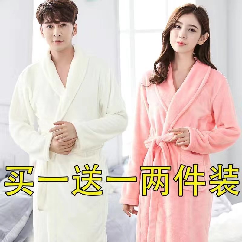买一送一加长加厚法兰绒睡袍男冬季加绒保暖浴袍睡衣女珊瑚绒浴衣