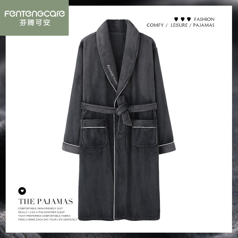 芬腾可安法兰绒睡袍男秋冬季加绒冬天中长款保暖珊瑚绒浴袍家居服
